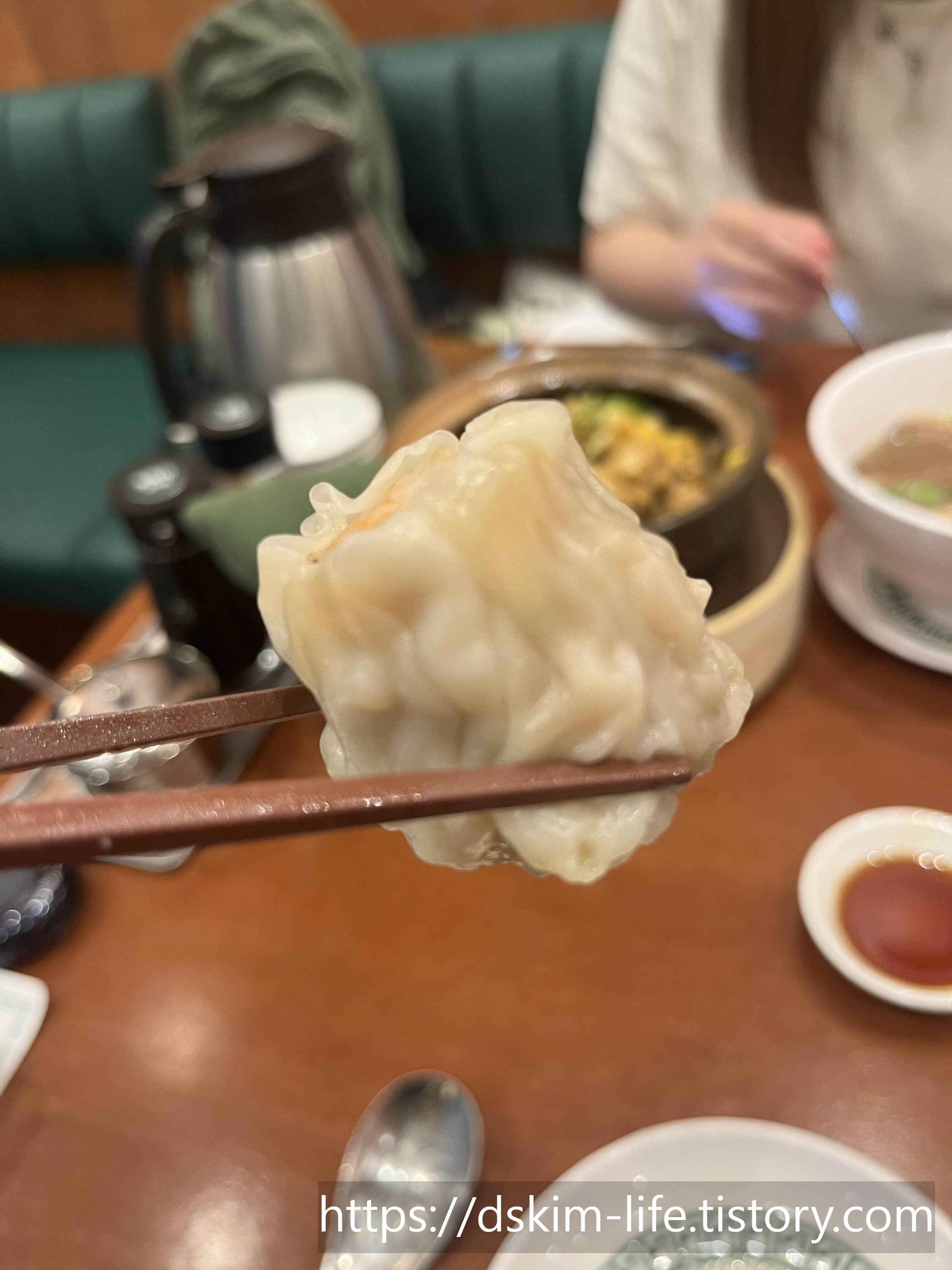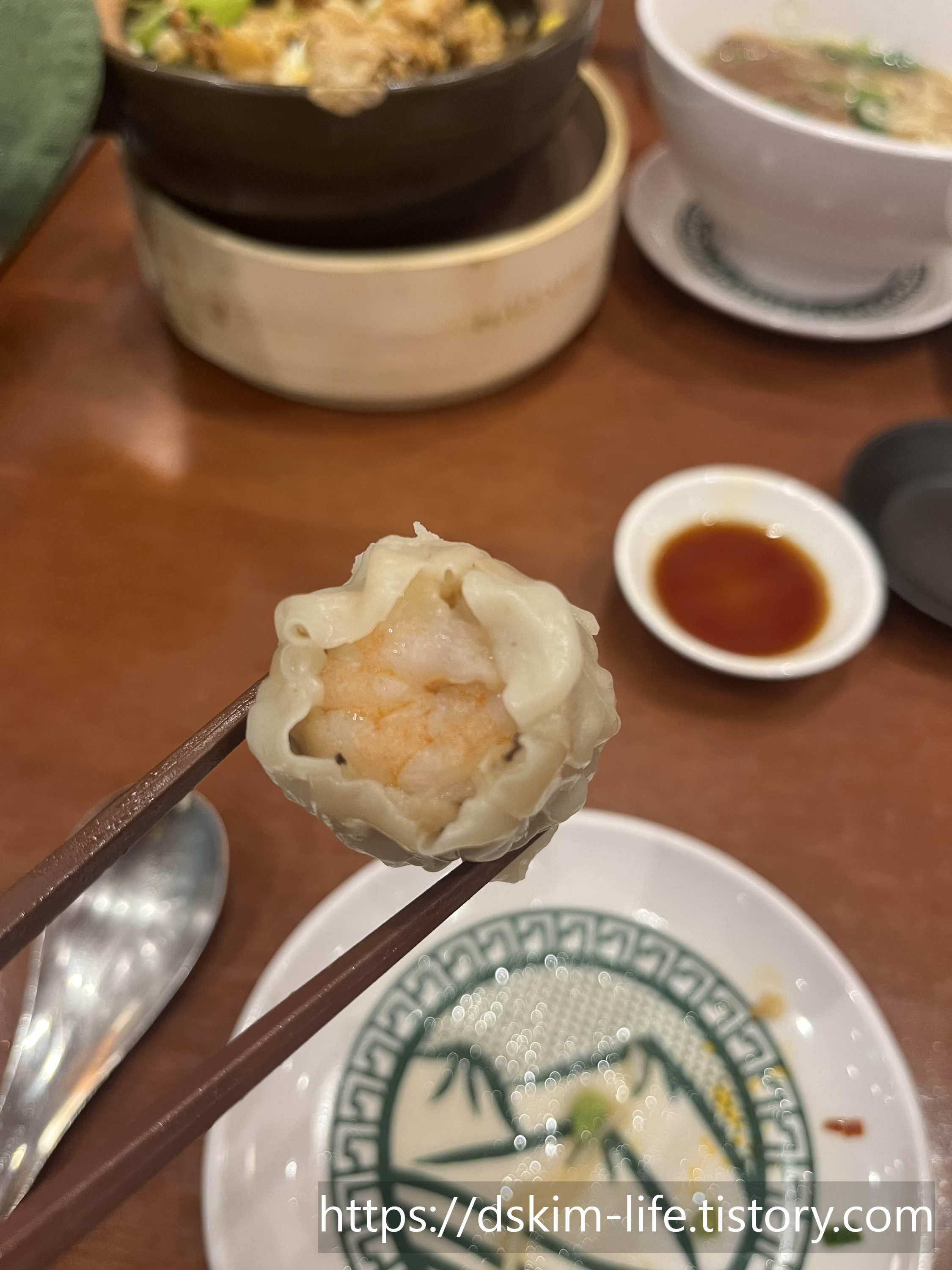 딤섬을 이렇게 한입 먹어봤어요. 새우가 있더라고요. 식감이 너무 좋았어요.