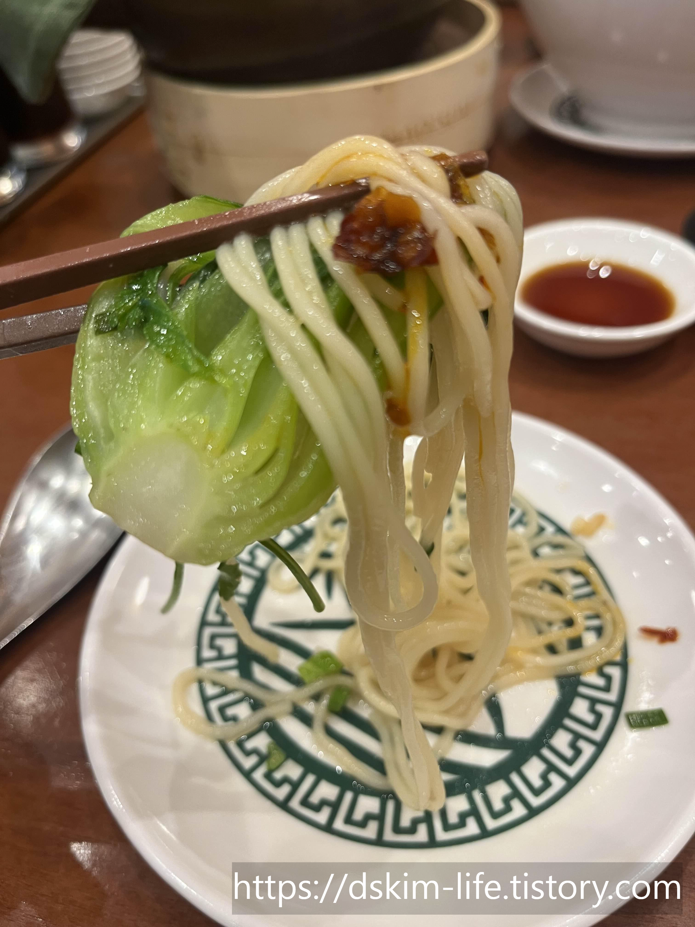 맑은 우육면에 들어있는 청경채에 면이랑 같이 먹으면 더욱 꿀맛입니다.