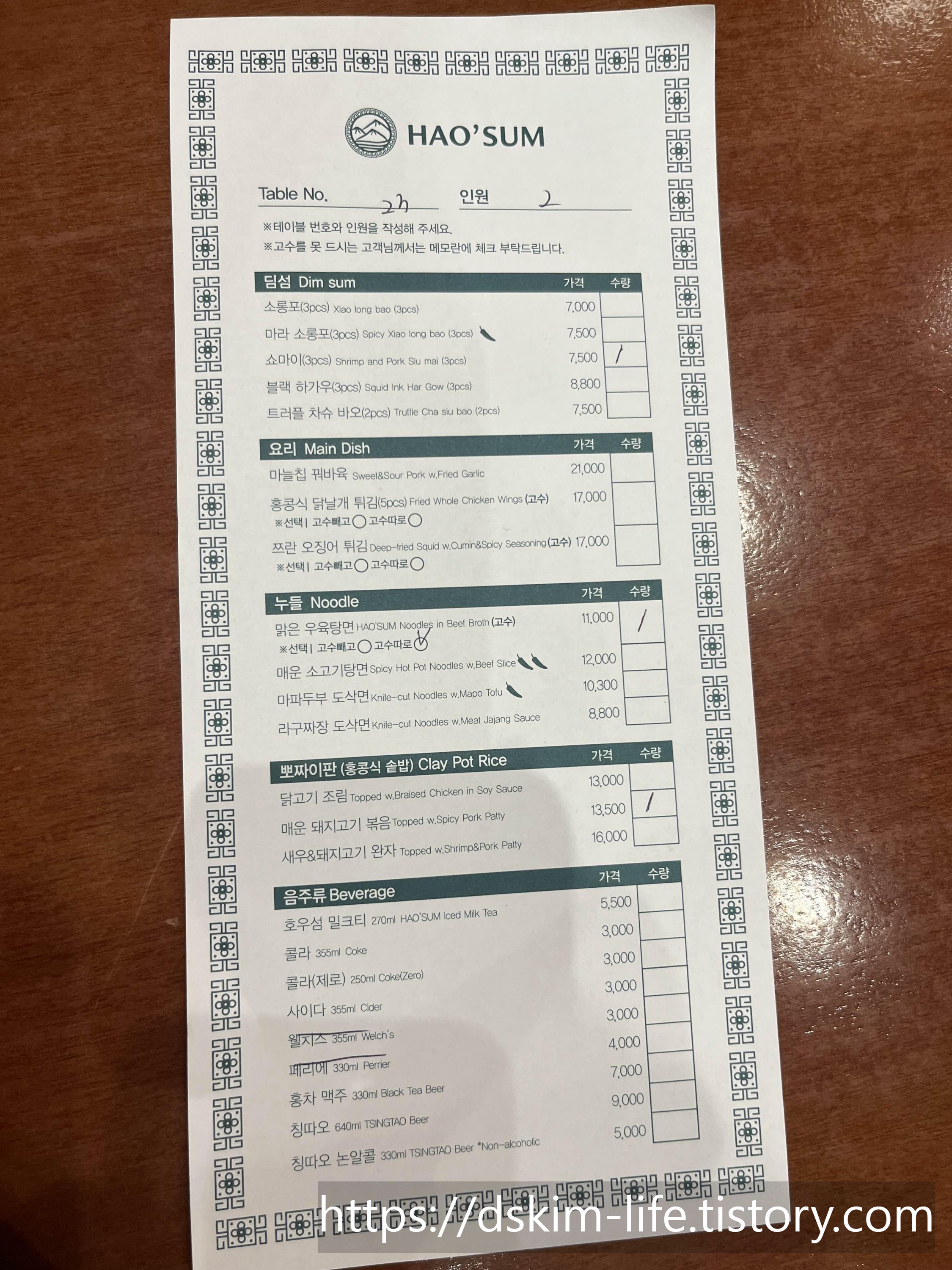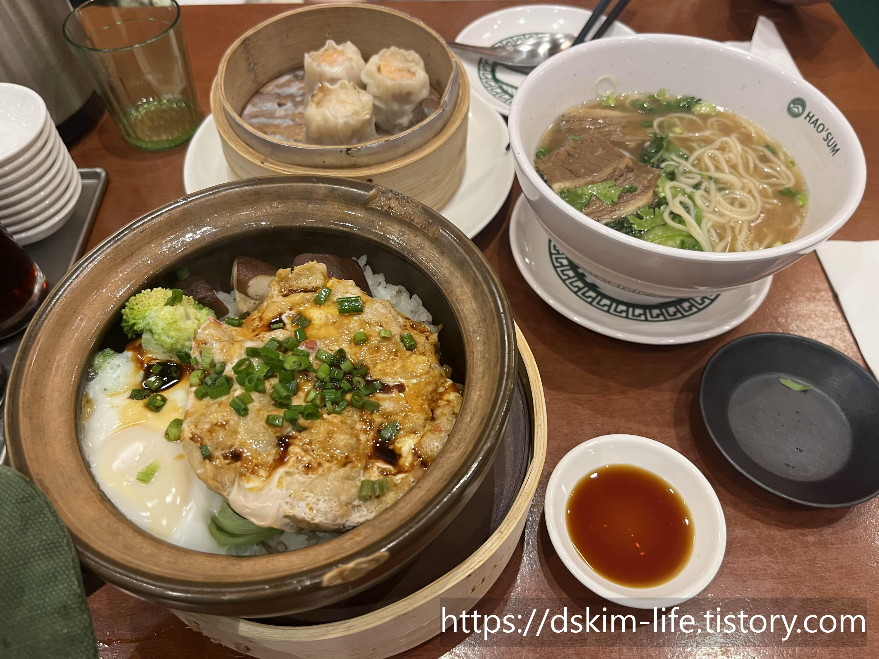 저희는 딤섬 쇼마이 3 pcs랑 맑은 우육탕면, 홍콩식 솥밥으로 맛은 매운 돼지고기 볶음으로 주문하였어요.
